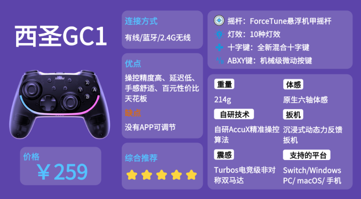 劣质游戏手柄常在摇杆和按键上偷工减料,导致漂移、触发不稳、震感空洞,长期使用不仅影响手感,还直接拖慢游戏表现。为解决这些痛点,西圣深耕精密操控与输入算法多年,这款电竞手柄几乎把核心技术一次性全堆上。自研AccuX精准操控算法通过AI动态建模与毫秒级轨迹预测,实现真正意义上的“零死区、零漂移”。核心ForceTune悬浮机甲摇杆采用磁悬浮霍尔结构+全金属骨架,让顺滑度、耐久度与稳定性全面越级。同样表现突出的还有沉浸式高精度L/R扳机,通过多级阻尼与微动结构模拟真实枪后坐力与赛车油门阻力;TurboS电竞级非对称双马达带来256级细腻震感与方向反馈,沉浸感显著增强。八向自由架构混合十字键配合机械级微动ABXY按键,触发迅速、回弹干脆;并支持一键可编程宏操作,复杂连招也能轻松完成。整体来看,无论是操控精度、回弹手感还是震感反馈,这款手柄都把同价位标准提升到新高度,实际体验已媲美原装手柄!