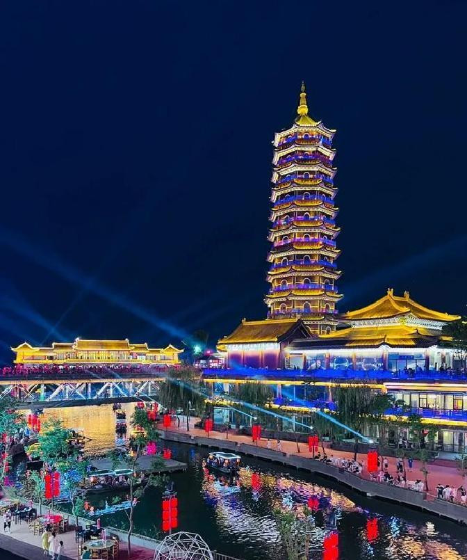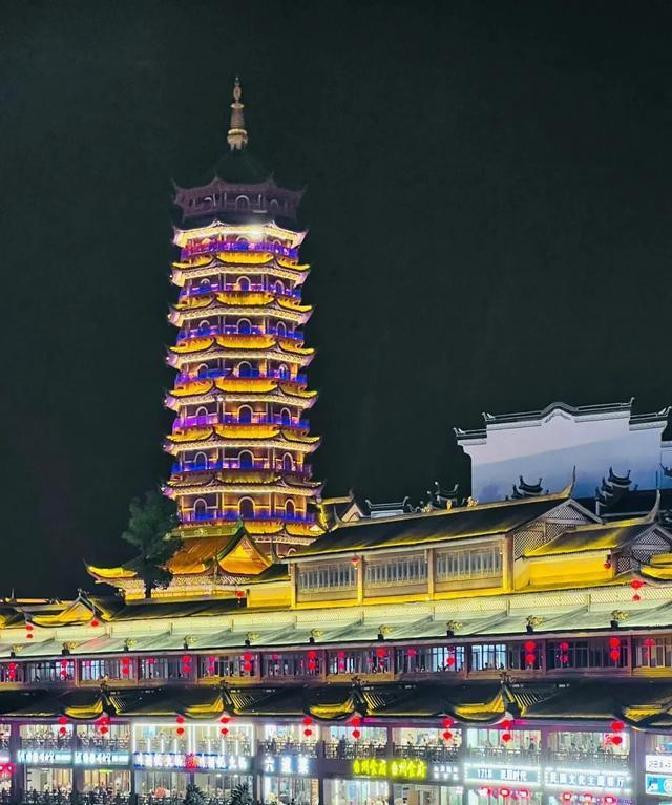 万佛塔被灯光包裹,像个金色的巨蛋,倒映在湖面上。