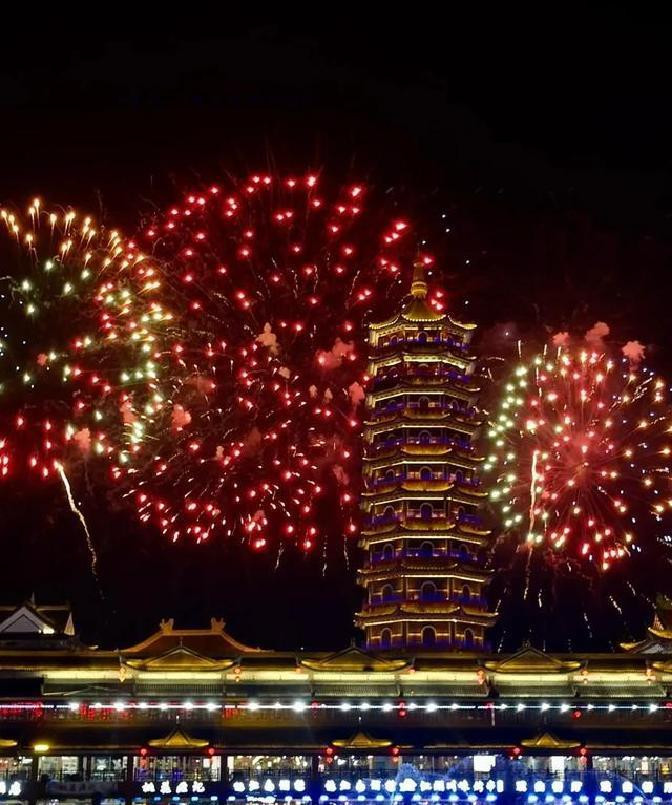 打铁花的一瞬间,火星四溅,夜空被照亮得像白昼。