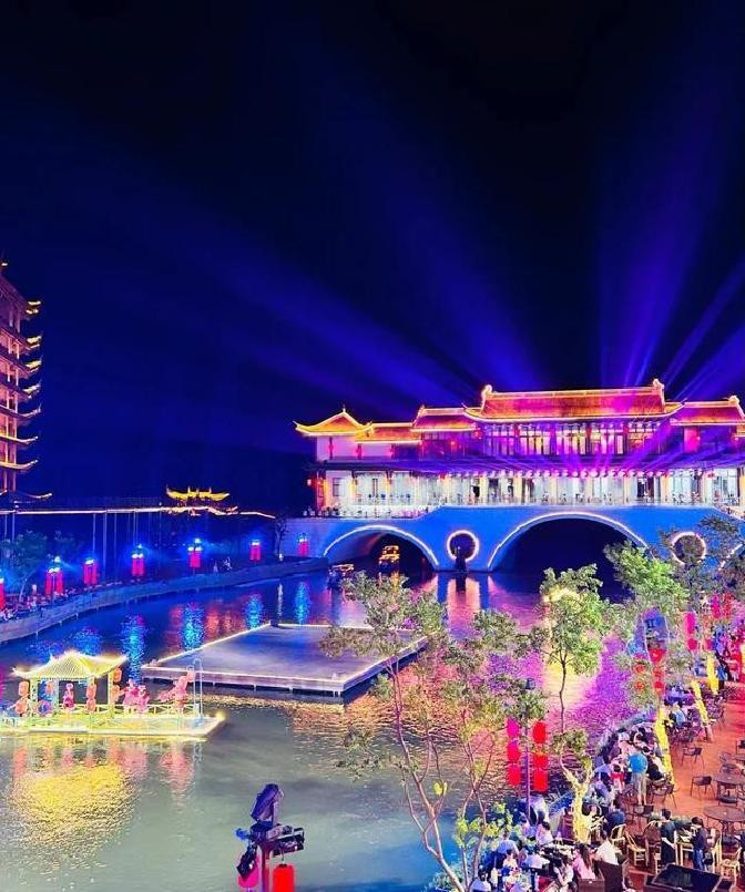 金黄色的灯带把屋檐描出轮廓,倒映在水里,像电影里的镜头。