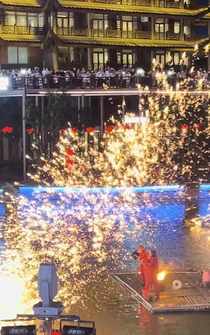 水舞结束后,人群没全散,他们就继续等打铁花。