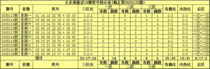 前区三区走势:上期前区奖号三区比为3:2:0,最近10期前区奖号三区比为23:17:10。